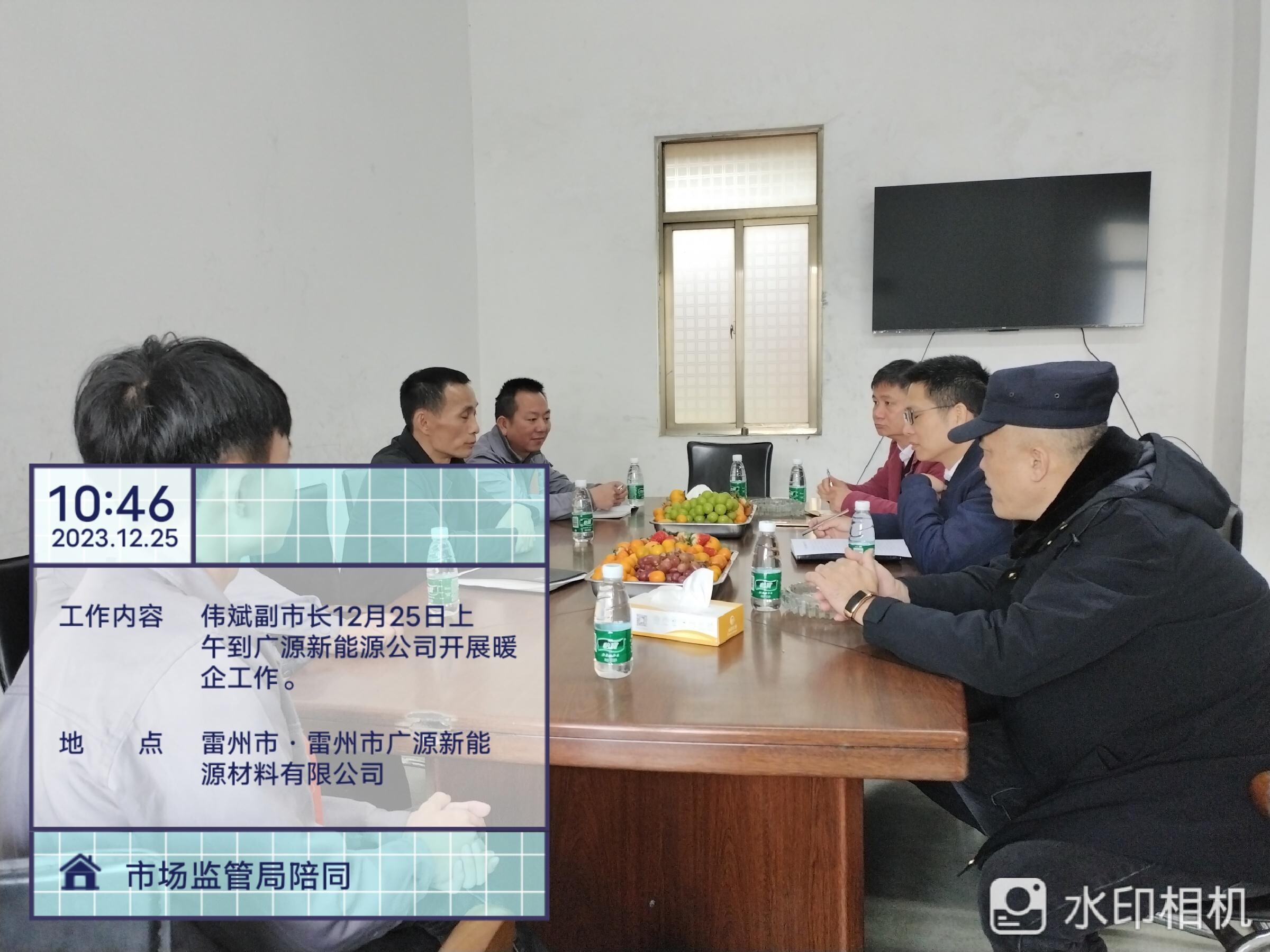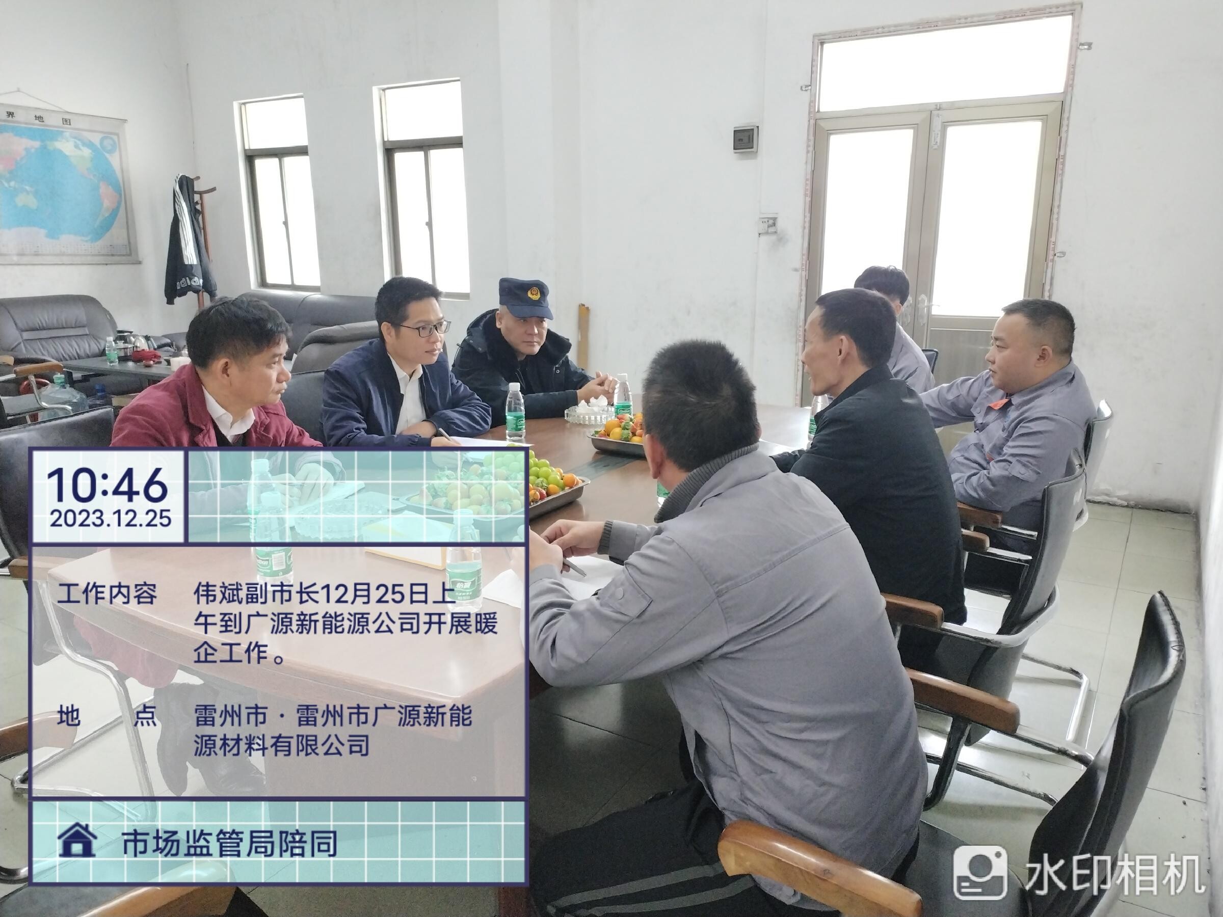 為進(jìn)一步做好暖企服務(wù),引導(dǎo)企業(yè)誠(chéng)信經(jīng)營(yíng),促進(jìn)市場(chǎng)信用體系建設(shè),以良好的信用環(huán)境助推營(yíng)商環(huán)境持續(xù)優(yōu)化,2023年12月25日,雷州市陳偉斌副市長(zhǎng)率領(lǐng)雷州市市場(chǎng)監(jiān)管局深入雷州市廣源新能源有限公司開(kāi)展暖企調(diào)研暨誠(chéng)信建設(shè)文化宣傳活動(dòng)。雷州市廣源新能源有限公司成立于2016年,位于雷州市白沙鎮(zhèn)邦企路7km段。企業(yè)致力于球形石墨和鋰離子電池碳負(fù)極材料、增碳劑的研發(fā)、生產(chǎn)、銷售。企業(yè)現(xiàn)生產(chǎn)球型石墨月產(chǎn)能在1000噸,年產(chǎn)能在1萬(wàn)噸,銷售額約一個(gè)億,納稅額約470萬(wàn)元。計(jì)劃在2023年增投5000萬(wàn)元,達(dá)到球型石墨加工年產(chǎn)值2萬(wàn)噸,銷售額約兩個(gè)億,納稅額突破約1000萬(wàn)元。